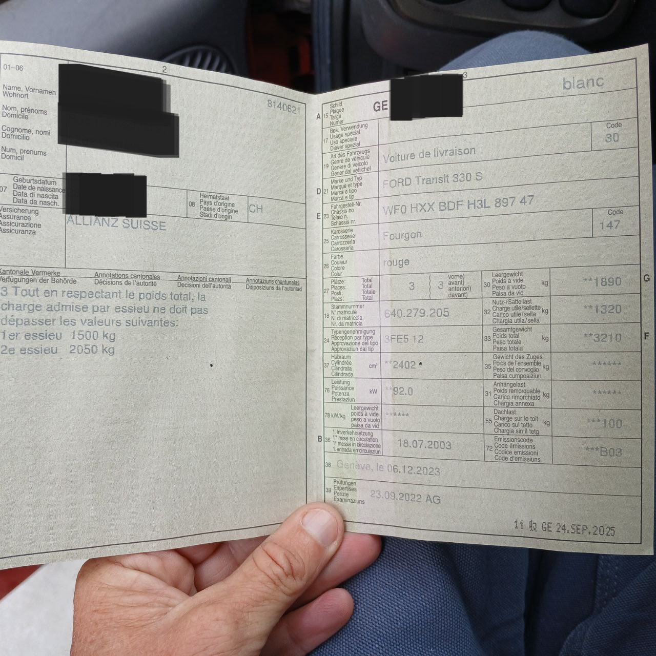 Données du véhicule FORD Transit 2.4 TD 330 S Van 96400 km 125 chevaux Diesel Boîte manuelle (5 vitesses) Traction : propulsion Cylindrée : 2,4 L Couleur extérieure : rouge Couleur intérieure : gris Portes : 5 Sièges : 3 Poids à vide : 1890 kg Hauteur : 2054 mm Largeur : 1974 mm Longueur : 4834 mm No de châssis : WF0 HXX BDF H3L 897 47 Catégorie de véhicule : occasion Consommation : 10,9 L / 7,1 L / 8,5 L Equipement 4 pneus neige Chauffage Sièges en tissu gris Radio cassette Crochet d’attelage Equipement supplémentaire 4 pneus été Description du véhicule Première mise en circulation : 2003 Dernière visite du contrôle technique (GE) : 24 septembre 2025 Contrôle antipollution : septembre 2025 Système d’injection (pompe) à faire réviser. Disponibilité immédiate